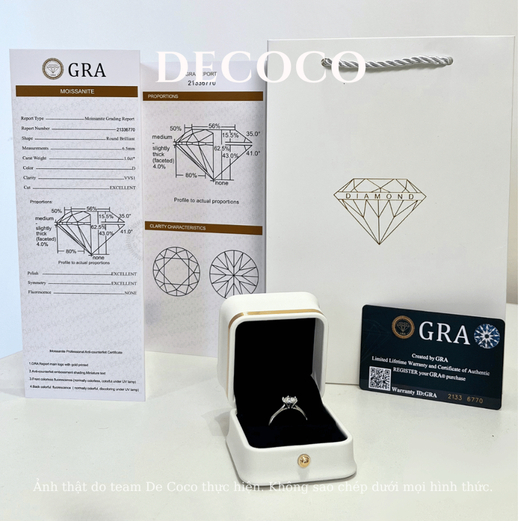 Nhẫn nữ kim cương moissanite DECOCO kiểm định GRA, bạc xi bạch kim Nora